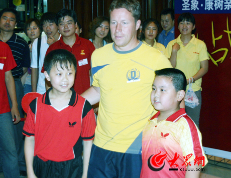 大眾網(wǎng)濟南6月20日訊 上午9點,離活動開始還有半小時的時間,位于北園路附近的銀座家居門前已是人滿為患,泉城市民紛紛前來爭睹乒壇大師的風(fēng)采。上午9點30分,活動正式開始,簡短的介紹儀式后,圣象地板的客戶代表,以及濟南的眾多乒乓球愛好者一一上場和大師切磋,由于時間的關(guān)系,每人只能和大師“過招”五個回合,很多人下場后都表示意猶未盡。但是知道“老瓦”還有接下來的活動,大家也都表示理解。圖為“老瓦”和小球迷親切合影。