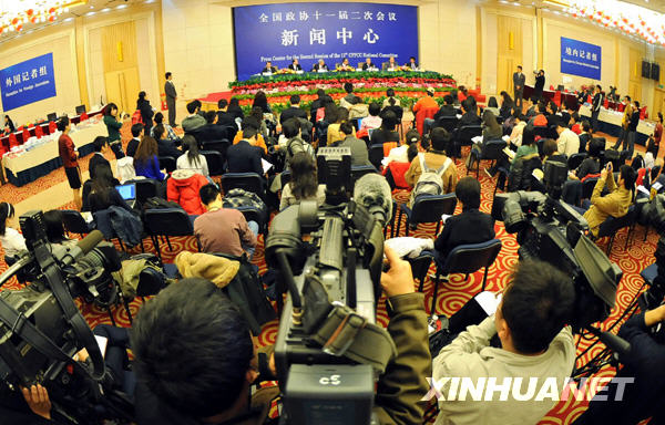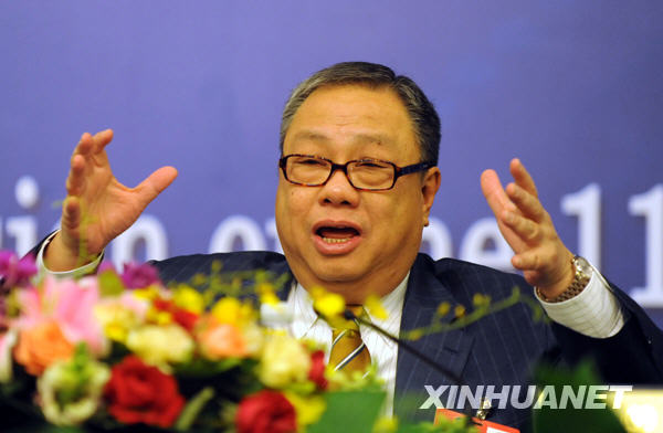 3月10日,全國政協十一屆二次會議在梅地亞兩會新聞中心舉行港澳委員集體采訪活動,主題是“港澳委員談如何應對全球金融危機”。蔡冠深、李家祥、陳永棋、顏延齡、張華峰、許健康等六位委員出席并回答記者提問。新華社記者謝環馳攝