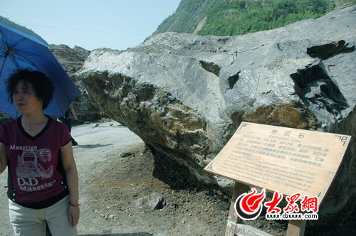 剛入地震公園,在廣場一角有塊地震石,這里震前原是一片良田,并無此石。震后,該石盤踞此處,與附近山體崩塌出的石頭材質迥異。它是東河口地球應力爆發震到這里的,還是因地殼擠壓從地底冒出,專家都不得而知。