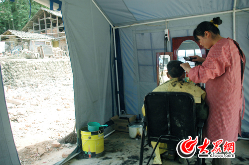 青川騎馬鄉王英在簡易帳篷內經營理發店