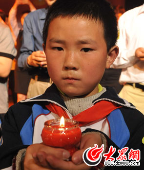 就讀于濟南友誼小學的地震災區學生點燃蠟燭祈福明天