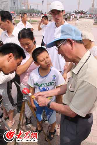 據了解,今年73歲的張老先生是一名十足的天文愛好者,雖然曾看過很多天文奇觀,但這次五百年一遇的日食仍舊讓他激動不已,連連稱奇。記者在現場看到,不少的市民借助這組望遠鏡觀看日食,老人則在一邊不厭其煩地為大家講解日食的相關知識。