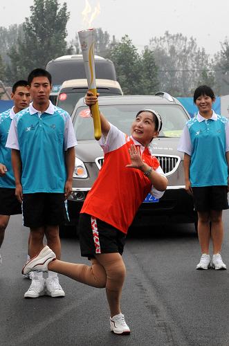 10月8日,火炬手章蘭在傳遞火炬。當日,第十一屆全國運動會火炬?zhèn)鬟f活動在山東聊城進行。