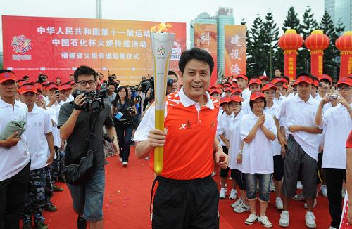 大眾網9月14日訊 據新華社消息,第十一屆全國運動會火炬傳遞活動福建省火炬傳遞起跑儀式今天在福州市五一廣場舉行。國家女排前主教練陳忠和成為第一棒火炬手。