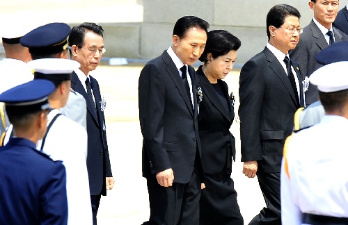 首爾,2009年5月29日 韓國為已故前總統盧武鉉舉行遺體告別儀式 5月29日,韓國總統李明博(中)偕夫人步入首爾景福宮前院,參加在這里舉行的已故前總統盧武鉉的遺體告別儀式。韓國各界當天上午在位于首都首爾市中心的景福宮舉行了規模盛大的前總統盧武鉉遺體告別儀式。 新華社/紐西斯通訊社