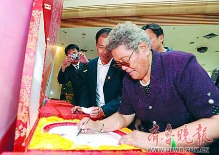 潘多在本報特別制作的“功勛盤”上簽名。 左慶 攝 |