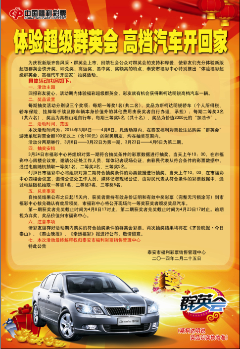 為回饋社會公眾對群英會的支持和厚愛,使彩友們充分體驗新版超級群英會快開獎、即兌獎、高返獎、易中獎、獎額高的特點,泰安市福彩中心特別推出“體驗福彩超級群英會,高檔汽車開回家”抽獎活動。市民在活動期內購買“群英會”彩票,最高可獲得斯柯達明銳高檔汽車。
