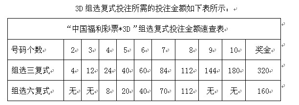 (注:組六復(fù)式投注如果選擇9和10個(gè)號(hào)碼,則投注金額比中獎(jiǎng)金額還高,是不合理的投注方式,不允許打印,沒有列出。)