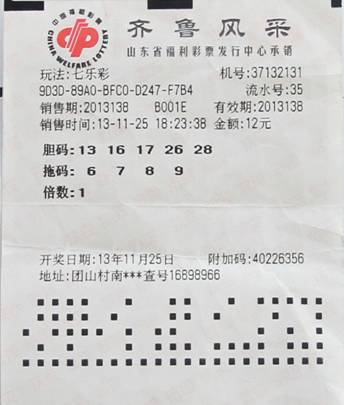 當天下午6點左右,他就趕到附近的37132131號福彩站。和熟識的彩友打過招呼后,他就坐下來研究七樂彩的走勢。經過短暫的十幾分鐘的分析,憑借著感覺選擇了五個膽碼:13、16、17、26、28,四個拖碼:6、7、8、9。不過在選7的時候,經過反復的考量,最后還是聽從了身邊彩友的建議,可以說這次能中大獎,旁邊的彩友幫了大忙。