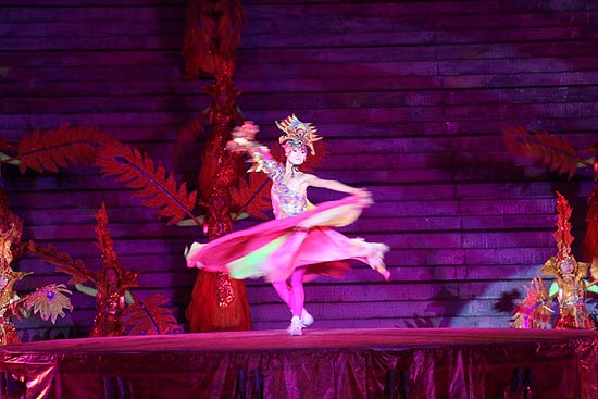 除了精彩的歌舞表演,現(xiàn)場(chǎng)的燈光也十分絢麗,激光燈的編織效果使夜色中的湖心島披上了如夢(mèng)如幻的色彩。同時(shí),燈光在舞臺(tái)上做出的微波蕩漾的藍(lán)色水面,更增加了奇妙感。