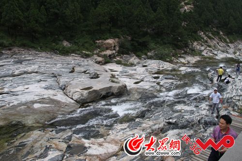 22日下午,網絡媒體山東行一行近百人抵達泰安市,在這里參觀采訪的首站就是桃花峪景區的彩石溪。