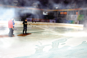 十一運會官方網站訊 隨著十一屆全運會冰上項目完美謝幕、花滑冰上專場晚會曲終人散之后,下一個在青島賽區進行比賽的項目是5月22日至29日進行的羽毛球預賽。為確保5月22日十一運會羽毛球預賽如期舉行,昨日起,國信體育公司制冰團隊立即投入緊張的化冰工作。為加快化冰速度,給地板等其它工程爭取時間,他們不得不使用熱水強制化冰。