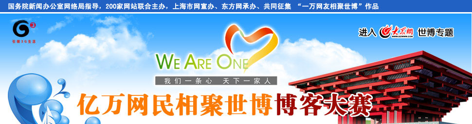 來吧,讓我們聚集于網絡平臺,敲擊鍵盤、拿起手機、操作相機、舉起DV, 記錄自己的真實經歷、拍下身邊的場景片斷,留住點點滴滴的世博影像,讓我們 書寫世博每一天的精彩難忘,讓上海世博會成為世博會歷史長河中最閃亮的記憶 。
