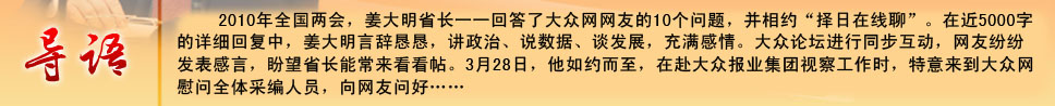 3月8日上午9點,記者拿到了姜大明省長給大眾網網友提問的親自回復,從農民增收到大學生就業,從藍色經濟到黃三角,從漲工資、辦戶口到困難縣的財政保障……4967個字,省長親切又細致地回答了網友的10個問題。