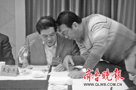 28日,在煙臺代表團的分組審議會場,王全杰代表(左)向其他代表講解自己編制的科技名詞解釋。 本報記者 魯超國 攝 |