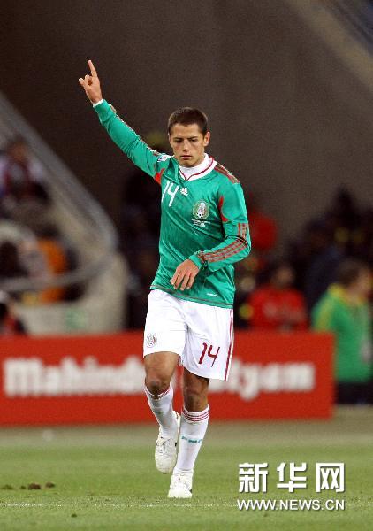 6月27日,墨西哥隊球員哈·埃爾南德斯進球后慶祝。當日,在約翰內斯堡足球城體育場舉行的2010年南非世界杯八分之一決賽中,阿根廷隊3比1戰勝墨西哥隊。新華社記者邢廣利攝