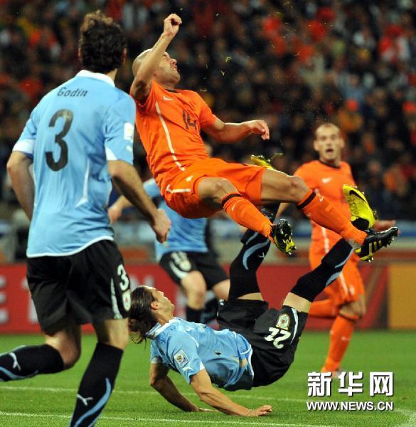 7月6日,荷蘭隊(duì)球員德澤烏(中上)與烏拉圭隊(duì)球員馬·卡塞雷斯(中下)拼搶。當(dāng)日,2010年南非世界杯半決賽第一場(chǎng)比賽在開普敦綠點(diǎn)球場(chǎng)舉行,荷蘭隊(duì)3比2戰(zhàn)勝烏拉圭隊(duì)。新華社記者楊磊攝