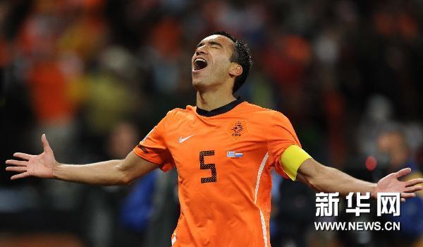 7月6日,荷蘭隊(duì)球員范布隆霍斯特進(jìn)球后慶祝。當(dāng)日,在開普敦綠點(diǎn)球場(chǎng)舉行的2010南非世界杯足球賽半決賽中,荷蘭隊(duì)3比2戰(zhàn)勝烏拉圭隊(duì)。新華社記者陳海通攝