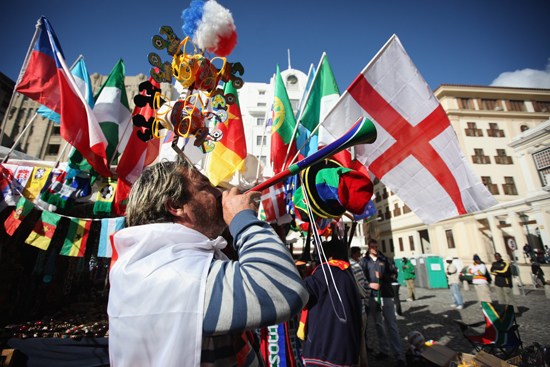 北京時間6月9日,2010年南非世界杯開幕在即,約翰內(nèi)斯堡成歡樂海洋,球迷足球城前載歌載舞。圖為球迷準(zhǔn)備助威“武器”。