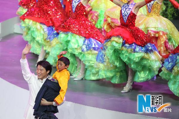 4月30日,中國2010年上海世博會開幕式文藝表演在上海世博園世博文化中心舉行。這是歌手抱起青海玉樹地震災區的孤兒江巴才仁。新華社記者廖宇杰攝