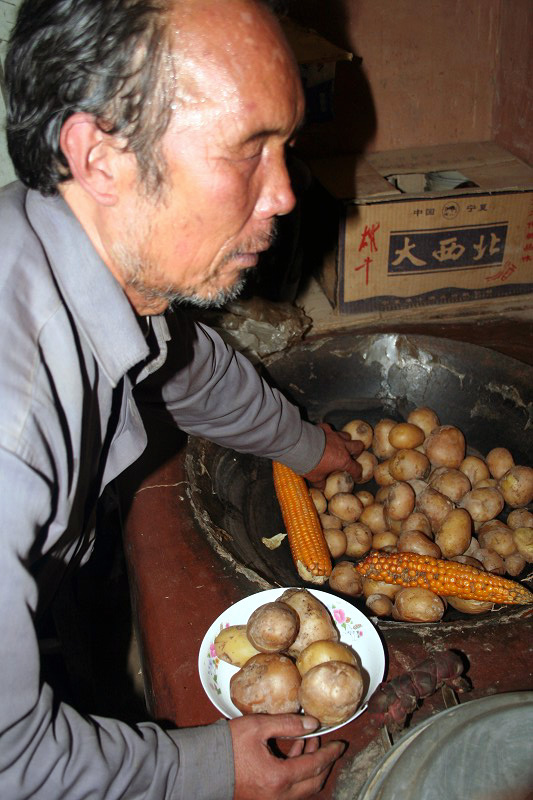 李國(guó)峰給母親遞土豆吃。(資料圖片)