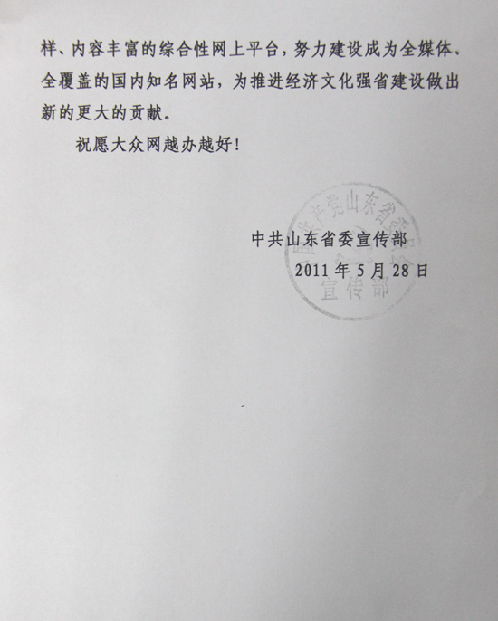[提要] 值此大眾網成立10周年之際,謹致以熱烈祝賀!大眾網成立10年來,在省委、省政府的正確領導下,始終高舉旗幟,圍繞中心,服務大局,堅持正確輿論導向,堅持權威性、大眾化、公信力的辦網宗旨,積極探索地方新聞網站成長規律,