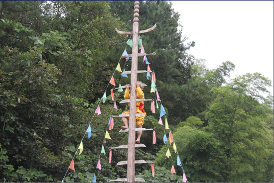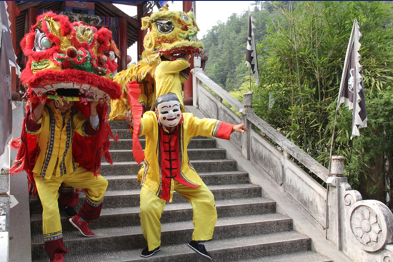 午飯過后,采訪團深入恩施土司城內,參觀了城內建筑,并觀看了舞獅表演、土家歌舞及“上刀山”表演,追尋著土家歷史文化。