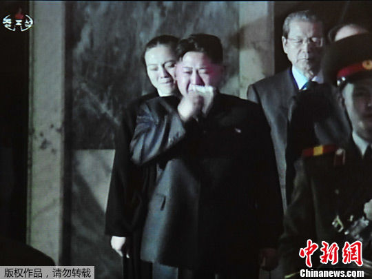 朝鮮中央電視臺的畫面顯示,金正恩當天率領黨政軍領導人在金正日靈柩前長時間默哀,之后在靈柩旁守靈并接受各界群眾吊唁。在現場吊唁群眾的哭聲和哀樂聲中,金正恩淚流滿面,掏出手帕擦去眼淚。