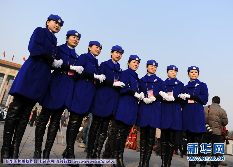 圖為大會服務人員的笑容綻放在天安門廣場上。3月5日,十一屆全國人民代表大會第四次會議在人民大會堂開幕。新華網 翟子赫攝