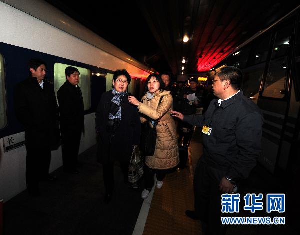3月1日6時,來自吉林的全國政協(xié)委員乘坐Z62次列車抵達(dá)北京站,這是首批抵京參加全國政協(xié)十一屆四次會議的京外委員。圖為遲寶榮委員(左三)在出站間隙接受采訪。新華社記者 張鐸 攝