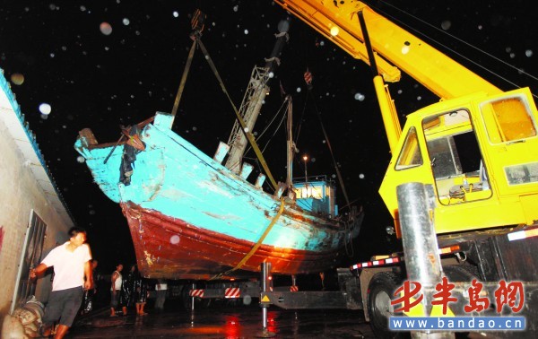 8月7日晚,沙子口南姜碼頭內,漁民正在連夜吊轉漁船。