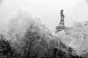 8月7日,游客在青島市嶗山區小麥島上游玩時,突遇臺風“梅花”所致的海上大浪,小島與陸地唯一相連的堤壩被阻斷,83人被困島上。青島市公安局接到報警,邊防、公安、消防等部門人員緊急趕赴現場展開救助。救援人員利用浪頭短暫間歇,分6批次將被困人員護送至陸地,使他們全部脫險。圖為一名被困的姑娘鞋子丟了,救援隊員背著她走過堤壩。