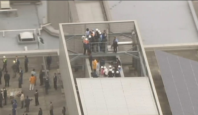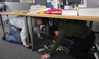 工作人員在桌下避難