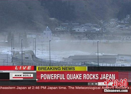 中新網3月11日電 據共同社報道,當地時間3月11日下午,日本東北地區(qū)以宮城縣為主的地方發(fā)生里氏8級以上強震,并引發(fā)大規(guī)模海嘯,截至目前,地震和海嘯已造成至少32人死亡,30多人失蹤,一艘載有約100人的船只被大浪卷走,宮城縣一處空軍基地已基本被淹沒。