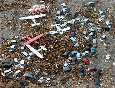 海嘯退后,機場的停機坪上一片廢墟,幾架小型客機和汽車被沖積在一起,敘述了這一場地震的慘烈。