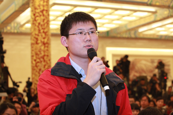 2011年3月4日11時,十一屆全國人大四次會議新聞發布會在人民大會堂三層金色大廳舉行,大會發言人介紹會議情況,并回答記者的提問。圖為人民日報社人民網記者提問。