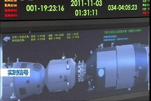 1時36分,擴音器里傳來:“天宮一號、神舟八號對接機構鎖緊,轉組合體飛行,交會對接完成!”
