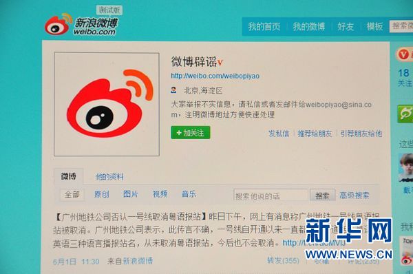 新浪微博專門開設的辟謠微博網頁畫面(6月4日攝)。新華社記者張逸之攝