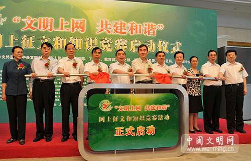 “文明上網,共建和諧”網上征文和知識競賽活動19日在人民大會堂舉行啟動儀式。這是由中央外宣辦、中央文明辦、最高人民法院、公安部、工信部、教育部、文化部、新聞出版總署、廣電總局、共青團中央等指導,人民網、新華網、中國網絡電視臺及新浪網、騰訊網等195家網站聯合主辦的。有關指導單位負責人和人民網、新華網等聯合主辦此次活動的網站負責人出席了啟動儀式。征文和知識競賽活動從8月19日開始至10月底結束。