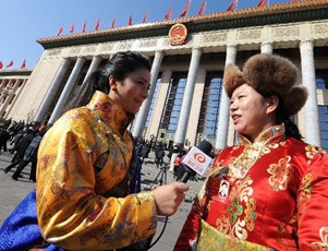 全國人大代表在大會堂前接受采訪