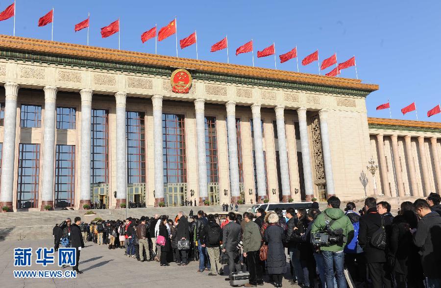 [提要] 3月14日,第十一屆全國人民代表大會第五次會議在北京人民大會堂閉幕。這是閉幕會前,記者排隊等待進入大會堂。