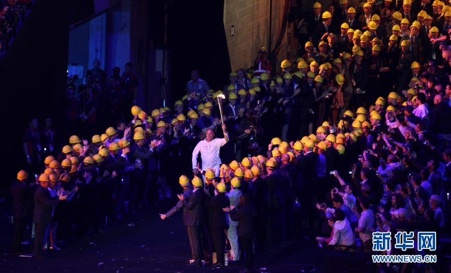 7月27日,第三十屆夏季奧林匹克運動會在英國倫敦開幕。圖為在開幕式上火炬手傳遞圣火。 新華社記者王麗莉攝