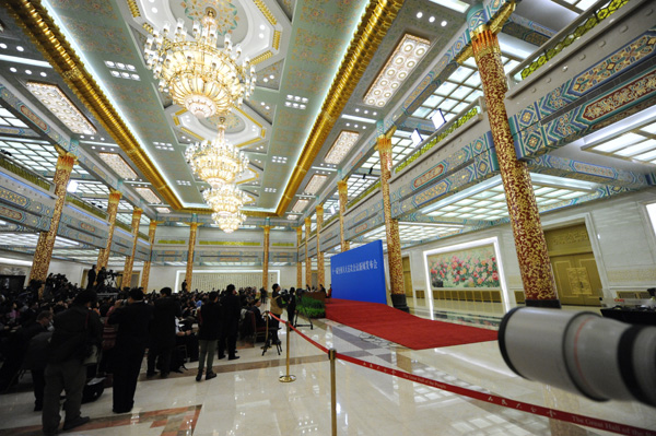 2012年3月4日上午11時,十一屆全國人大五次會議在人民大會堂三樓金色大廳舉行新聞發(fā)布會,由大會發(fā)言人就會議議程和人大工作相關(guān)的問題回答中外記者的提問。圖為發(fā)布會現(xiàn)場。新華網(wǎng) 王翰林 攝