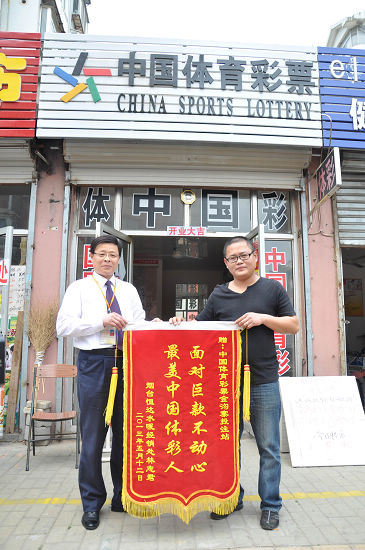 2013年5月14日上午,彩友林先生來到煙臺體彩芝罘區金溝寨小區05672站點,將一面寫著“面對巨款不動心,最美中國體彩人”的錦旗鄭重地送到了該體彩站站長任春銘手里。原來,幾天前林先生到任站長的店里買體育彩票,不慎將一個裝有10萬元現金的包裹遺忘在那里,任站長誠信守護巨款19個小時,終將10萬元現金“完璧歸趙”。