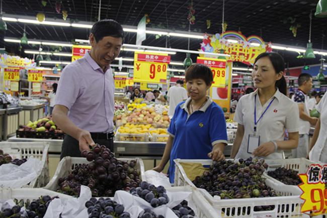 林申社(左)在檢查超市產(chǎn)品質(zhì)量
