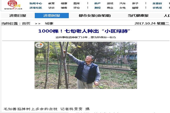 毛如善是原山東交通學院工會主席,舜耕街道舜雅社區居民。五月微風習習,往年的這個時候,他總會買好樹苗,親手在小區里種下,精心維護社區綠化,然而今年陽光舜城茂密的紫槐林里卻再也看不到毛如善修剪樹枝的忙碌身影了。往事依稀,這位七旬老人堅持用10余年的時間,栽種樹木1000余株,種出一片小區“共享綠肺”。