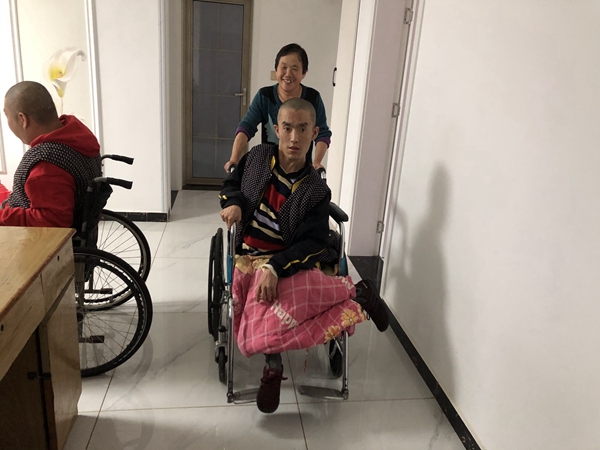 “以前冬天沒暖氣,兩個孩子不能活動怕冷,我給他們每個人都做了30多條棉褲,每天棉褲都像棉被那么厚。他們大小便都不能自理,經常把棉褲、被褥弄臟,我每天給他們換幾條、經常拆洗,但就是這樣,兩個孩子的腿上凍得都是黑色的泡。”提起這些,周素真難掩心酸。“前年我們回遷到花園社區了,冬天有暖氣,孩子也沒那么受罪了!闭f到這里,她又笑了起來!昂⒆娱L大了,我歲數也越來越大,已經抱不動他們了,以后我們歲數大了,可能照顧他們就更難了!敝芩卣嬲f。
