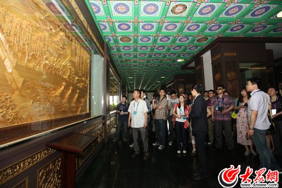 超然樓內的非物質文化遺產展示吸引了記者們的濃厚興趣。(盛堃 攝)