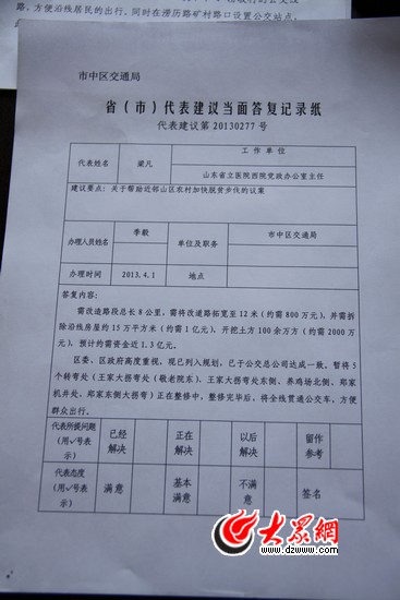今天下午,大眾網(wǎng)記者見(jiàn)到了濟(jì)南市人大代表梁凡。他告訴記者,最近幾天,濟(jì)南市交通運(yùn)輸局、市中區(qū)交通局、市中區(qū)農(nóng)業(yè)局的有關(guān)負(fù)責(zé)人先后找到他,對(duì)他提交的“幫助近郊山區(qū)農(nóng)村加快脫貧步伐”的建議進(jìn)行了面復(fù)。