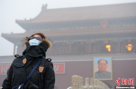 1月29日,一名游客在北京天安門城樓前。當日北京霧霾天持續,空氣嚴重污染。劉震 攝